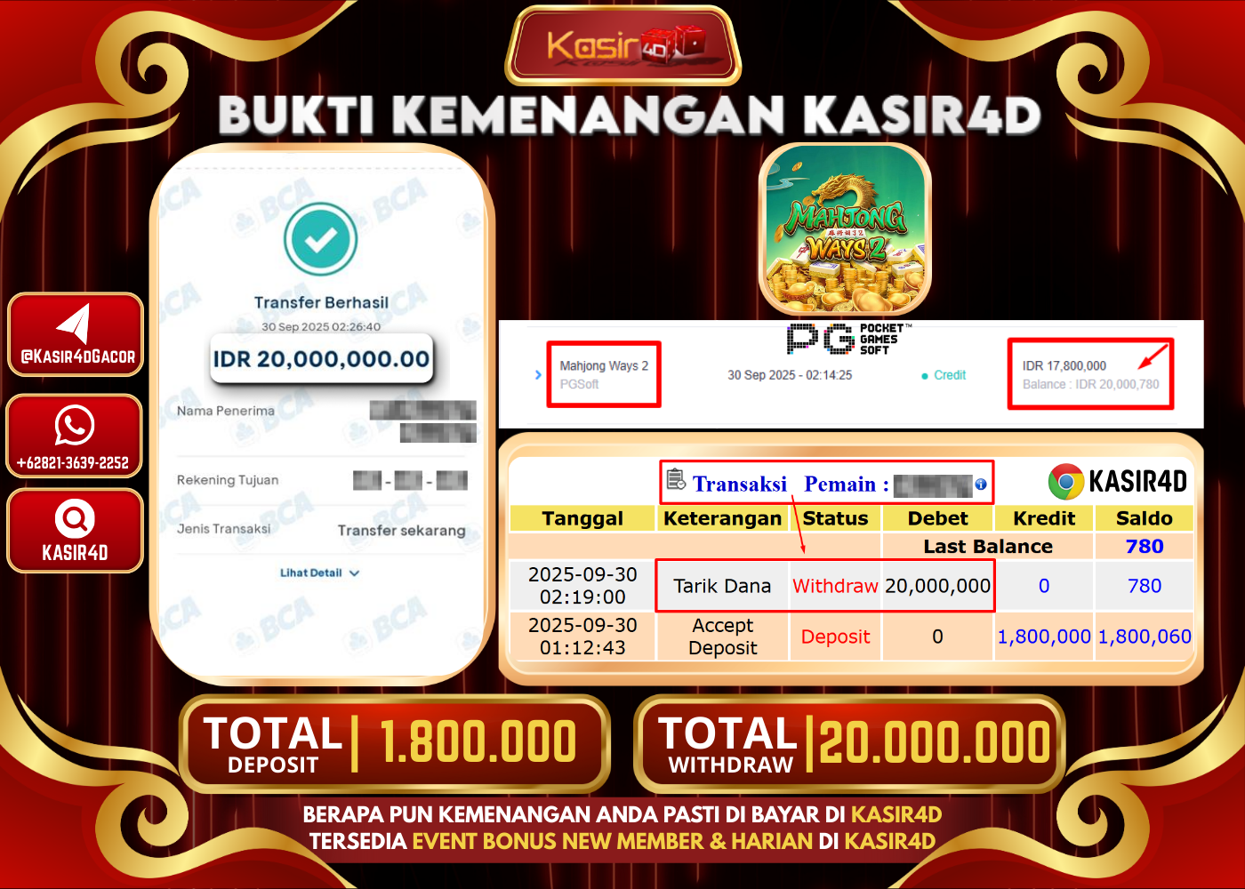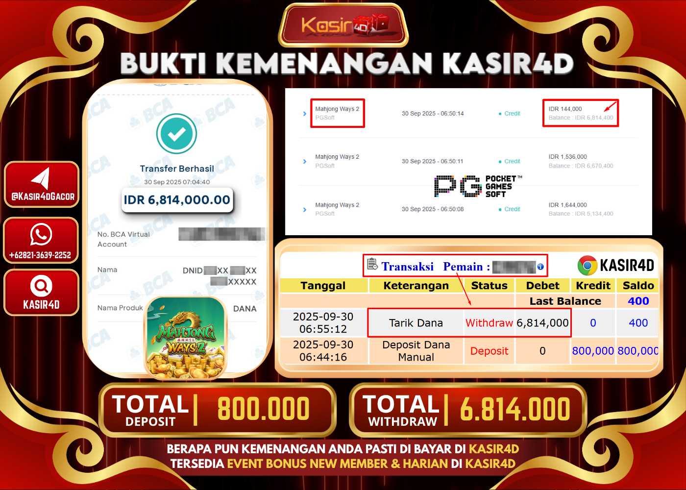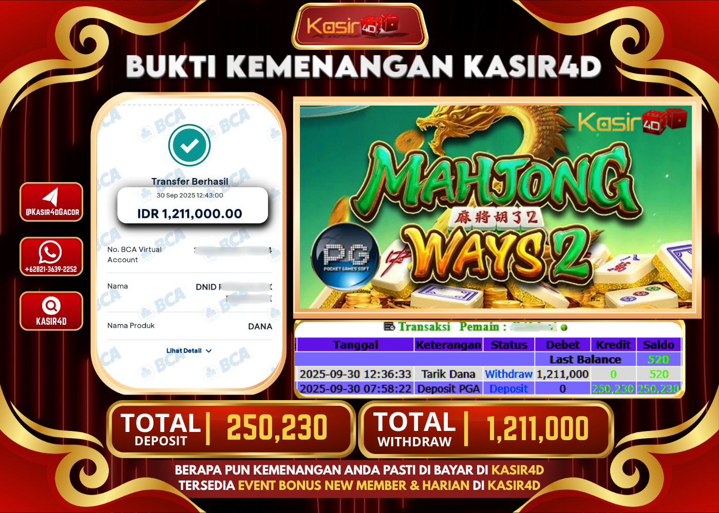 KASIR4D, Selamat Kepada User Id : Tiu*****r73 Atas Withdraw Hari ini Tgl 30 September 2025Rp. 1,211,000 Di Game PG SOFT MAHJONG…
