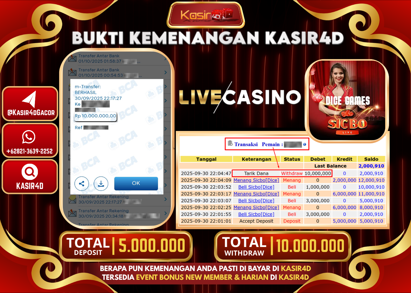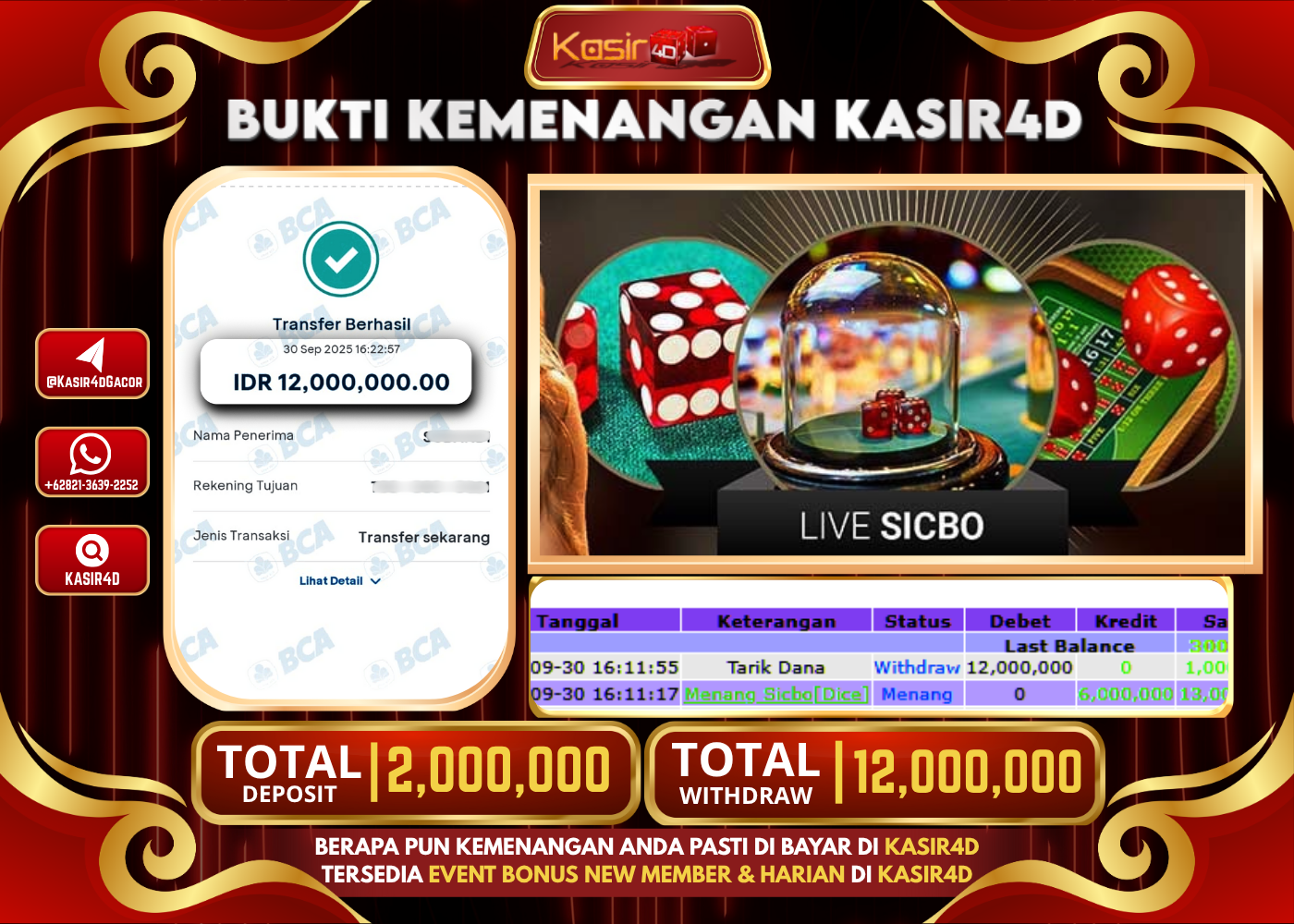 KASIR4D, Selamat Kepada User Id : Wil****l67 Atas Withdraw Hari ini Tgl 30 September 2025Rp. 12,000,000 Di Game LIVE CASINO SICBO…