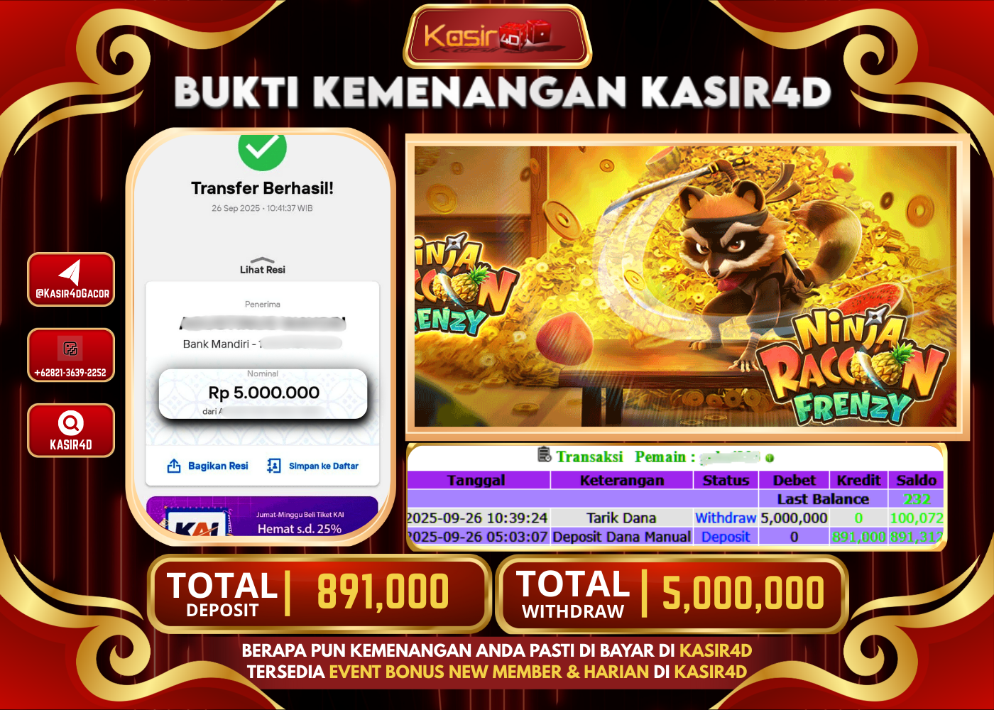 KASIR4D, Selamat Kepada User Id : Un****ti365 Atas Withdraw Hari ini Tgl 26 September 2025Rp. 5,000,000 Di Game PG SOFT NINJA…