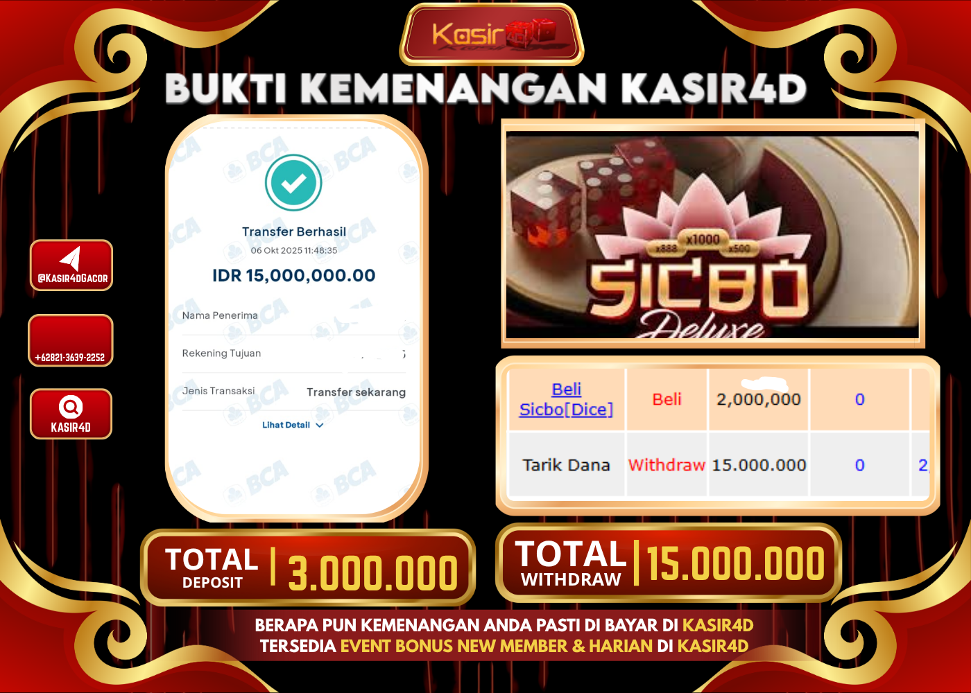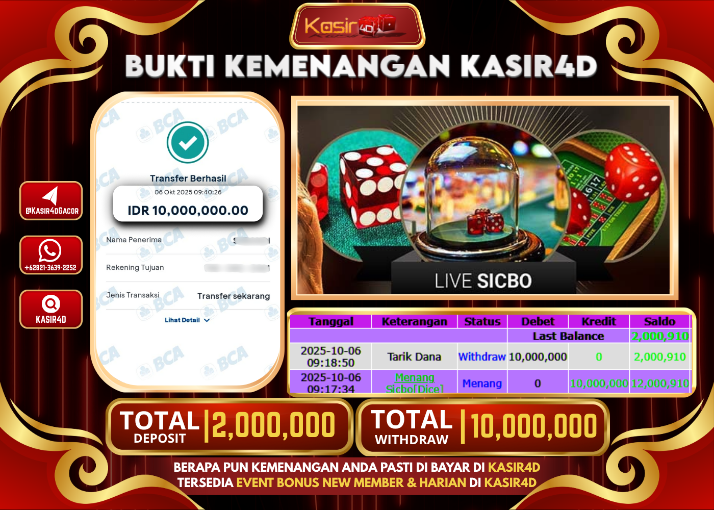 KASIR4D, Selamat Kepada User Id : Wil*****y88 Atas Withdraw Hari ini Tgl 06 Oktober 2025Rp. 10,000,000 Di Game LIVE CASINO SICBO…