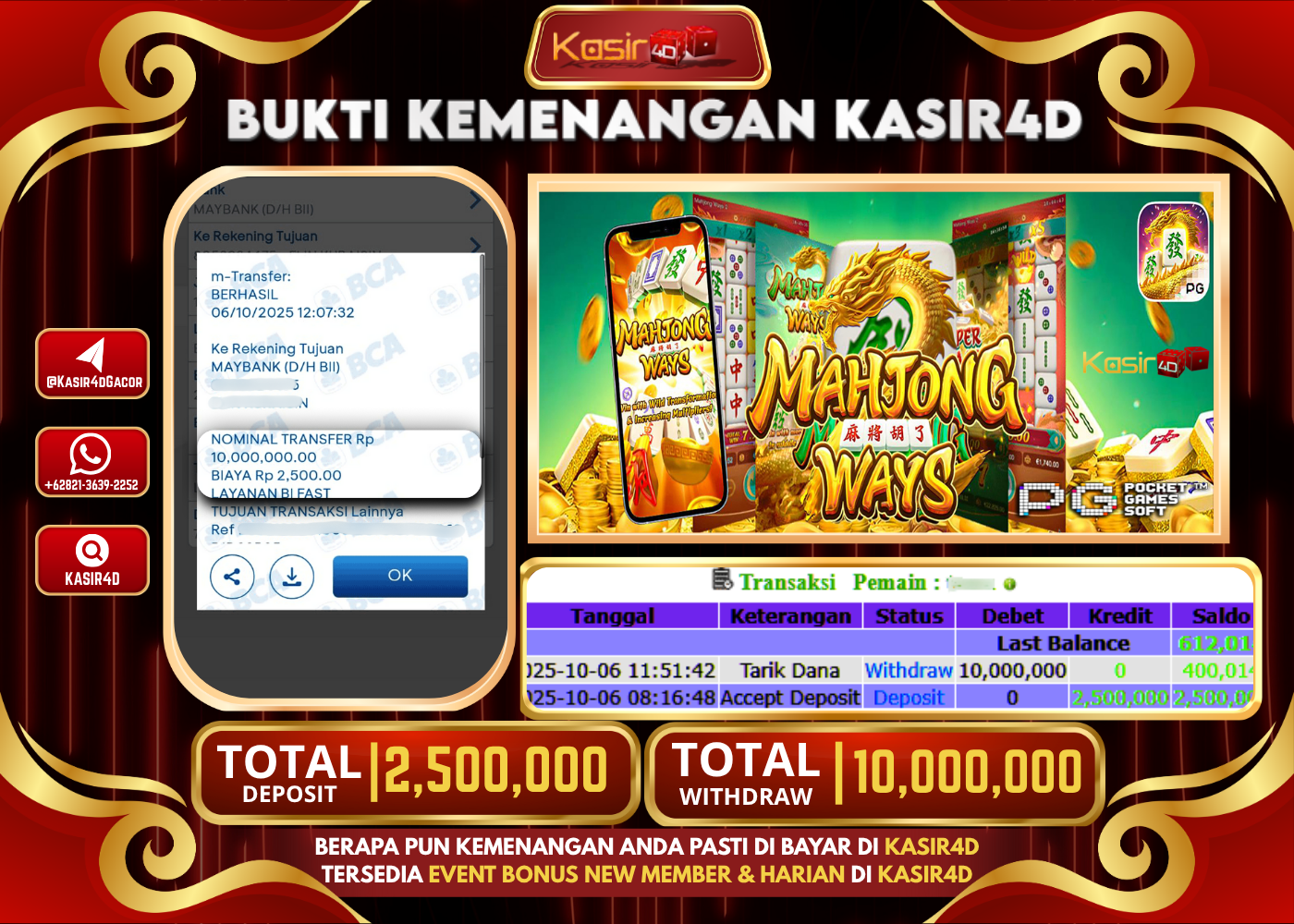 KASIR4D, Selamat Kepada User Id : Tuk*****tuk888 Atas Withdraw Hari ini Tgl 06 Oktober 2025Rp. 10,000,000 Di Game PG SOFT MAHJONG…
