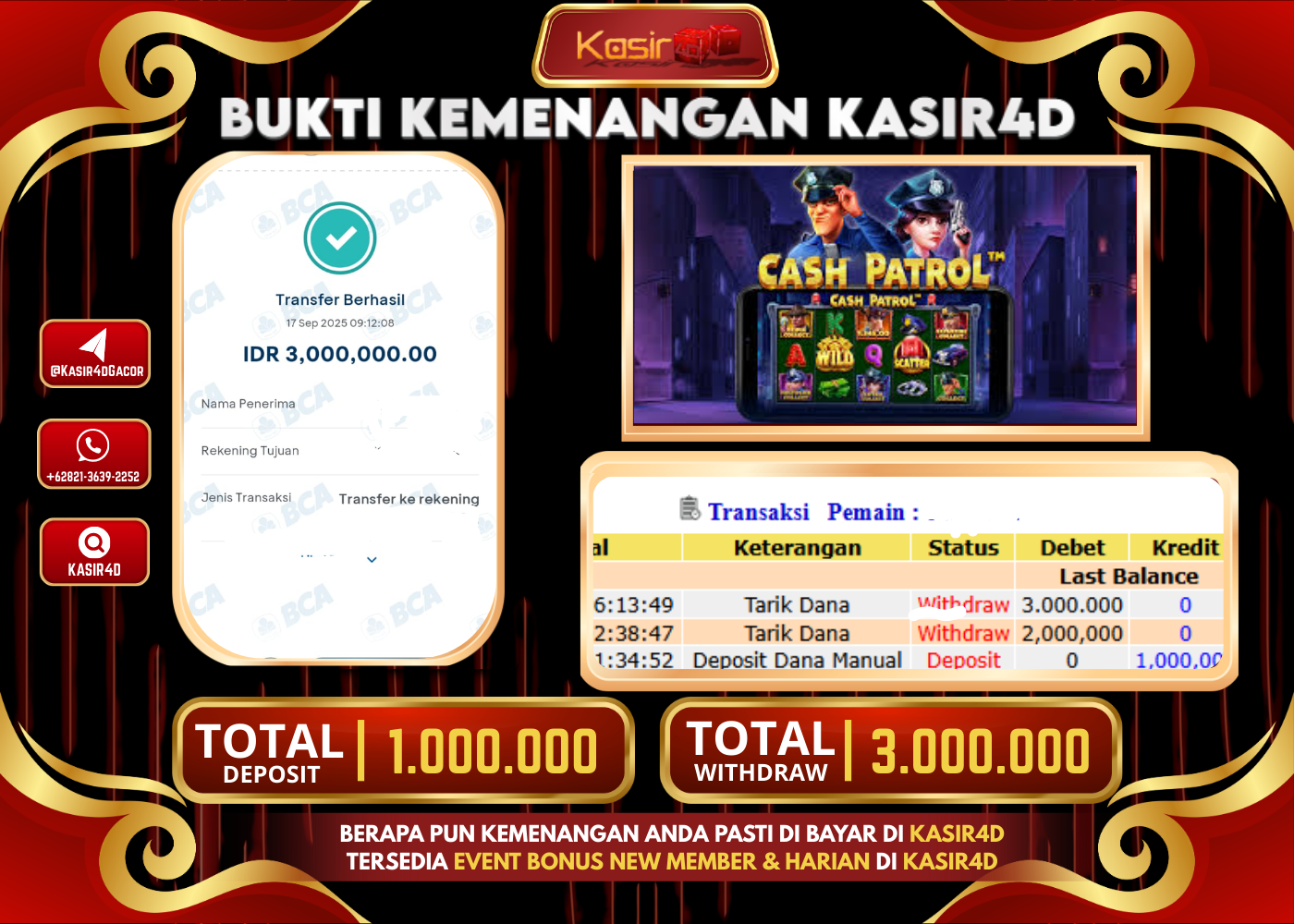 Tgl 17 SEPTEMBER 2025 Rp.3.000.000 Di Game Pragmatic Play CASH PATPOL