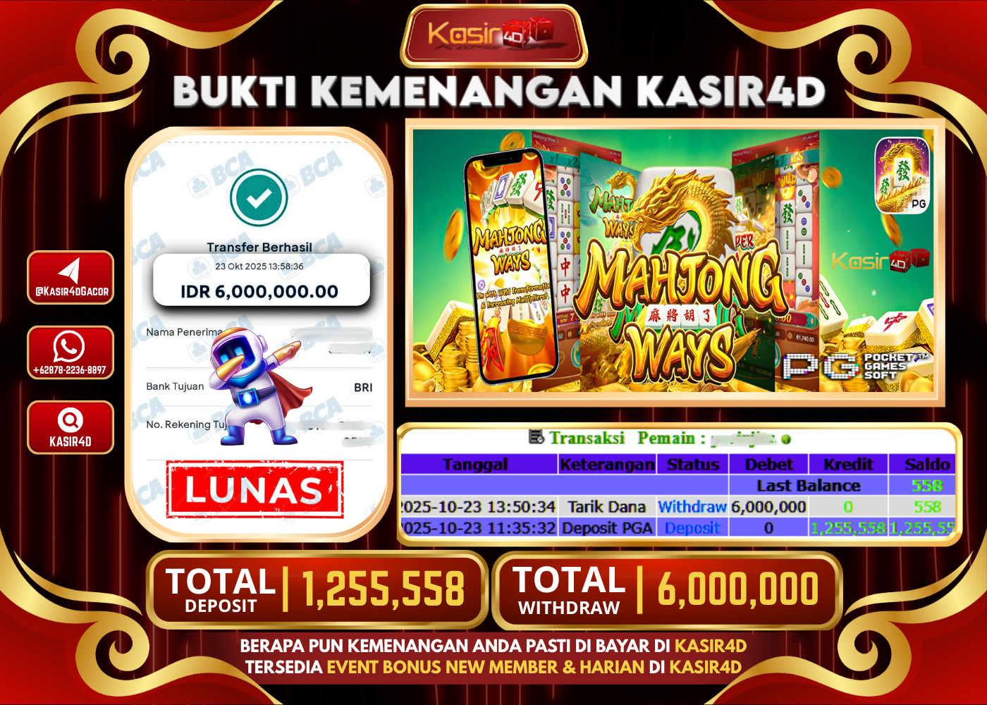 Maka tidak disangsikan kembali bila Anda memilih untuk mendaftarkan dan bermain di website slot Gacor KASIR4D , Anda terang mempunyai kesempatan besar untuk memperoleh jackpot maxwin yang spektakuler dibanding situs slot online yang lain secara umum.