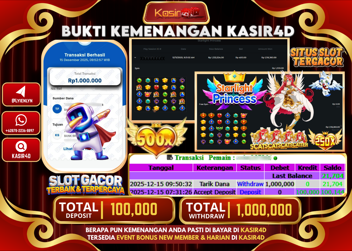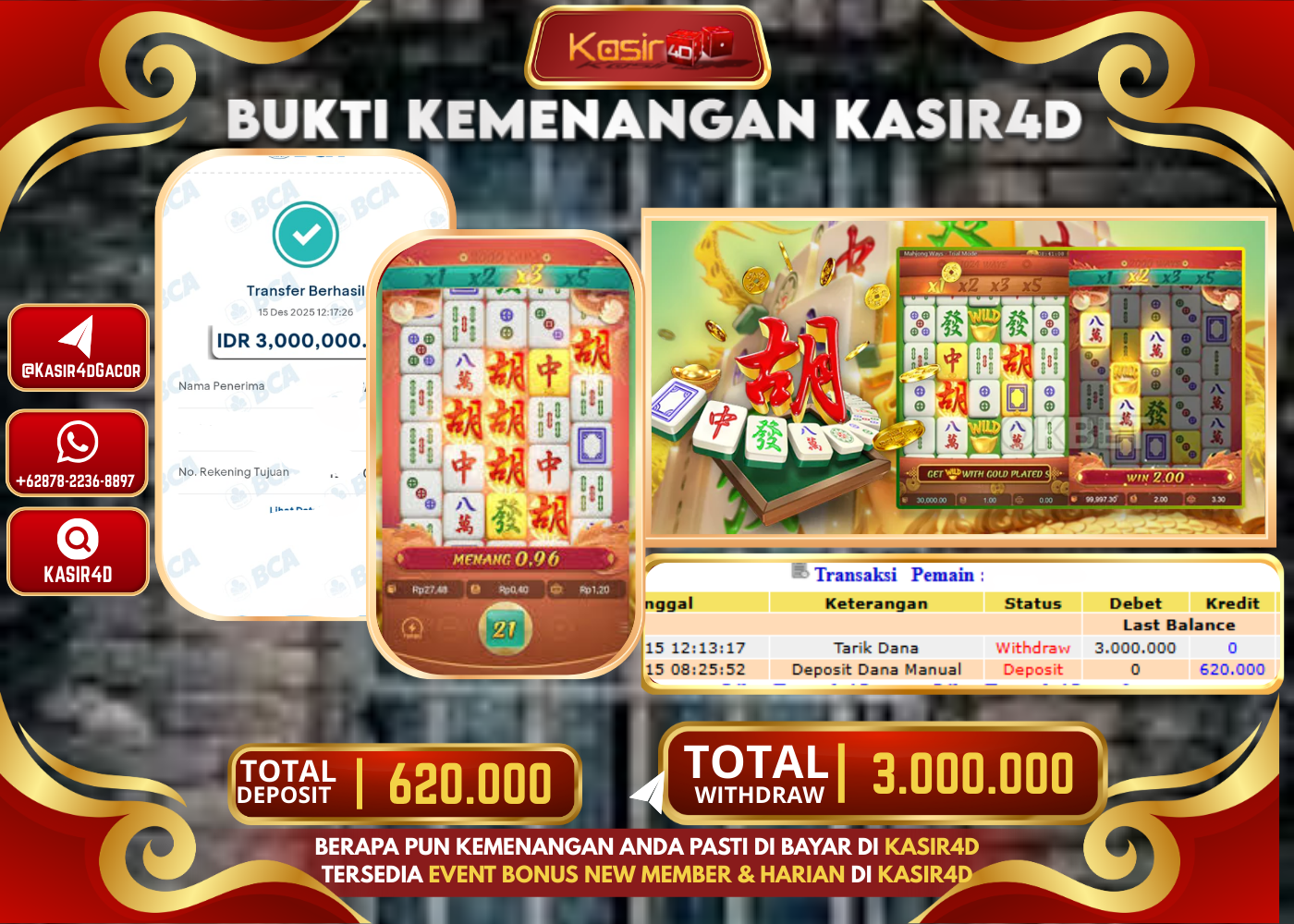 Maka tidak disangsikan kembali bila Anda memilih untuk mendaftarkan dan bermain di website slot Gacor KASIR4D , Anda terang mempunyai kesempatan besar untuk memperoleh jackpot maxwin yang spektakuler dibanding situs slot online yang lain secara umum.