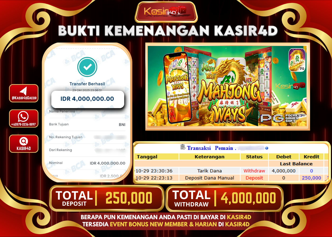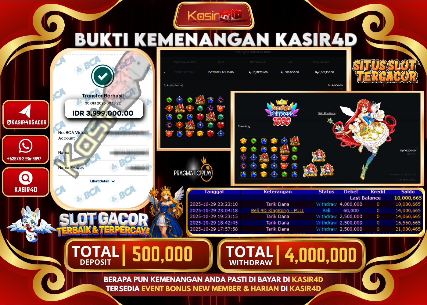Tak hanya itu, Kasir4d juga menghadirkan promo dan bonus spesial, seperti bonus deposit 50% setiap hari untuk semua permainan slot. Bonus ini tentunya meningkatkan nilai lebih dalam pengalaman bermain Anda.