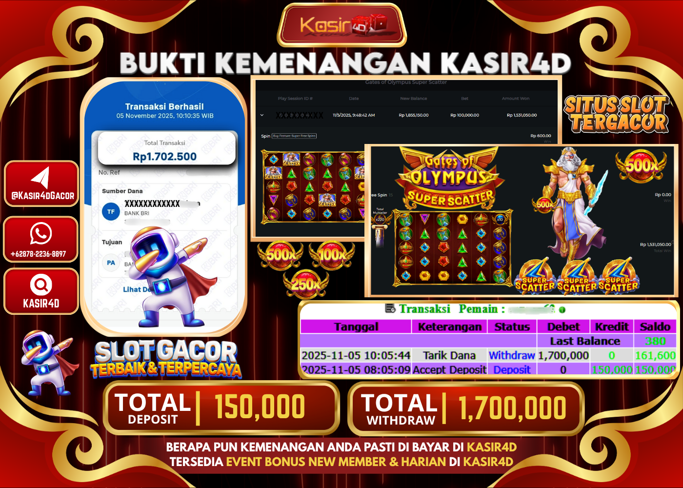 Maka tidak disangsikan kembali bila Anda memilih untuk mendaftarkan dan bermain di website slot Gacor KASIR4D , Anda terang mempunyai kesempatan besar untuk memperoleh jackpot maxwin yang spektakuler dibanding situs slot online yang lain secara umum.