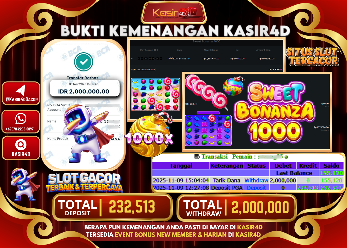 Maka tidak disangsikan kembali bila Anda memilih untuk mendaftarkan dan bermain di website slot Gacor KASIR4D , Anda terang mempunyai kesempatan besar untuk memperoleh jackpot maxwin yang spektakuler dibanding situs slot online yang lain secara umum.