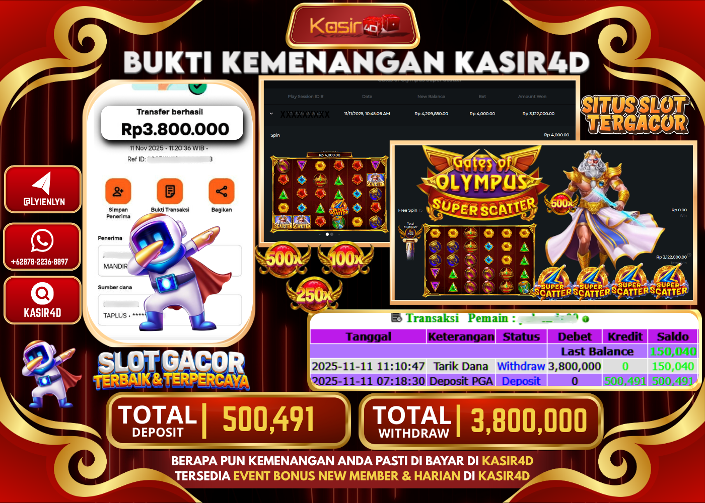 Maka tidak disangsikan kembali bila Anda memilih untuk mendaftarkan dan bermain di website slot Gacor KASIR4D , Anda terang mempunyai kesempatan besar untuk memperoleh jackpot maxwin yang spektakuler dibanding situs slot online yang lain secara umum.
