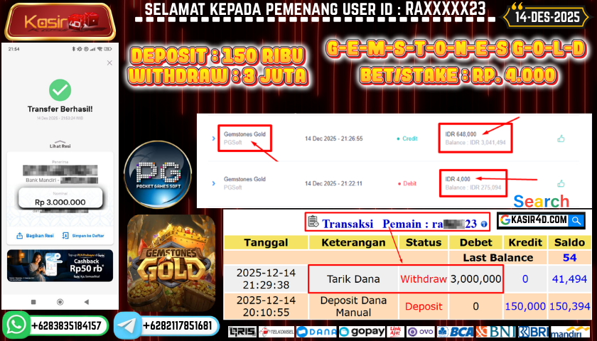 Tgl 14 Desember 2025 Rp. 3.000.000 Di Game Pg Soft Gemstones Gold