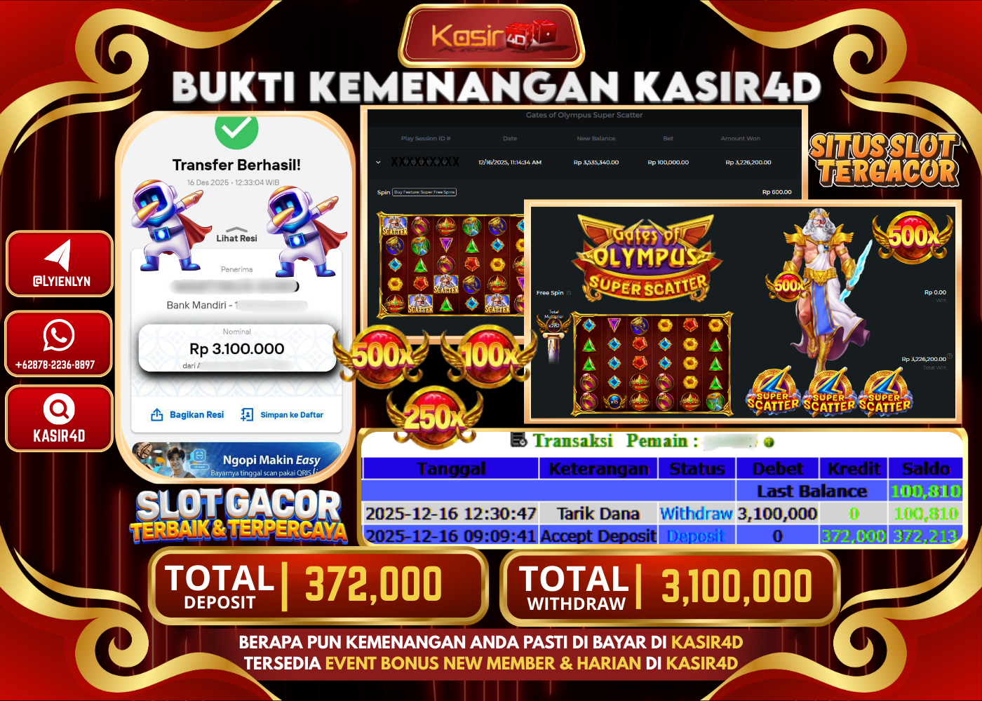Maka tidak disangsikan kembali bila Anda memilih untuk mendaftarkan dan bermain di website slot Gacor KASIR4D , Anda terang mempunyai kesempatan besar untuk memperoleh jackpot maxwin yang spektakuler dibanding situs slot online yang lain secara umum.