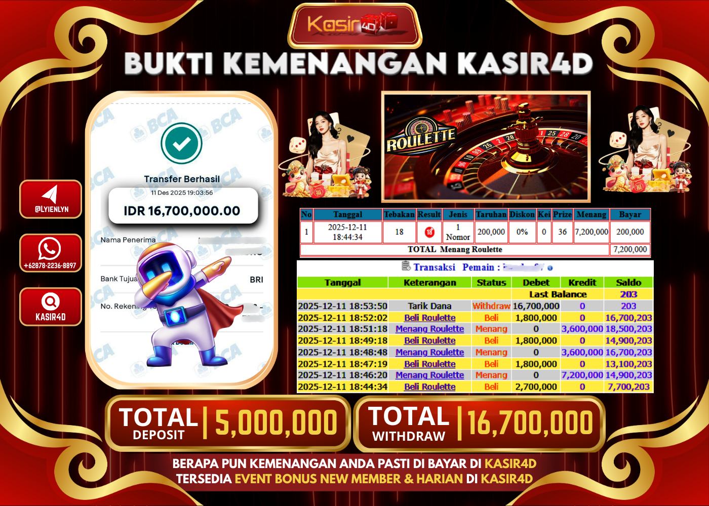Maka tidak disangsikan kembali bila Anda memilih untuk mendaftarkan dan bermain di website slot Gacor KASIR4D , Anda terang mempunyai kesempatan besar untuk memperoleh jackpot maxwin yang spektakuler dibanding situs slot online yang lain secara umum.
