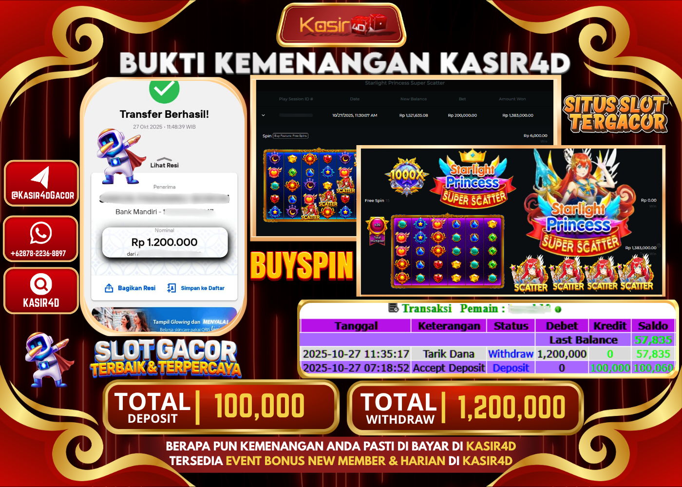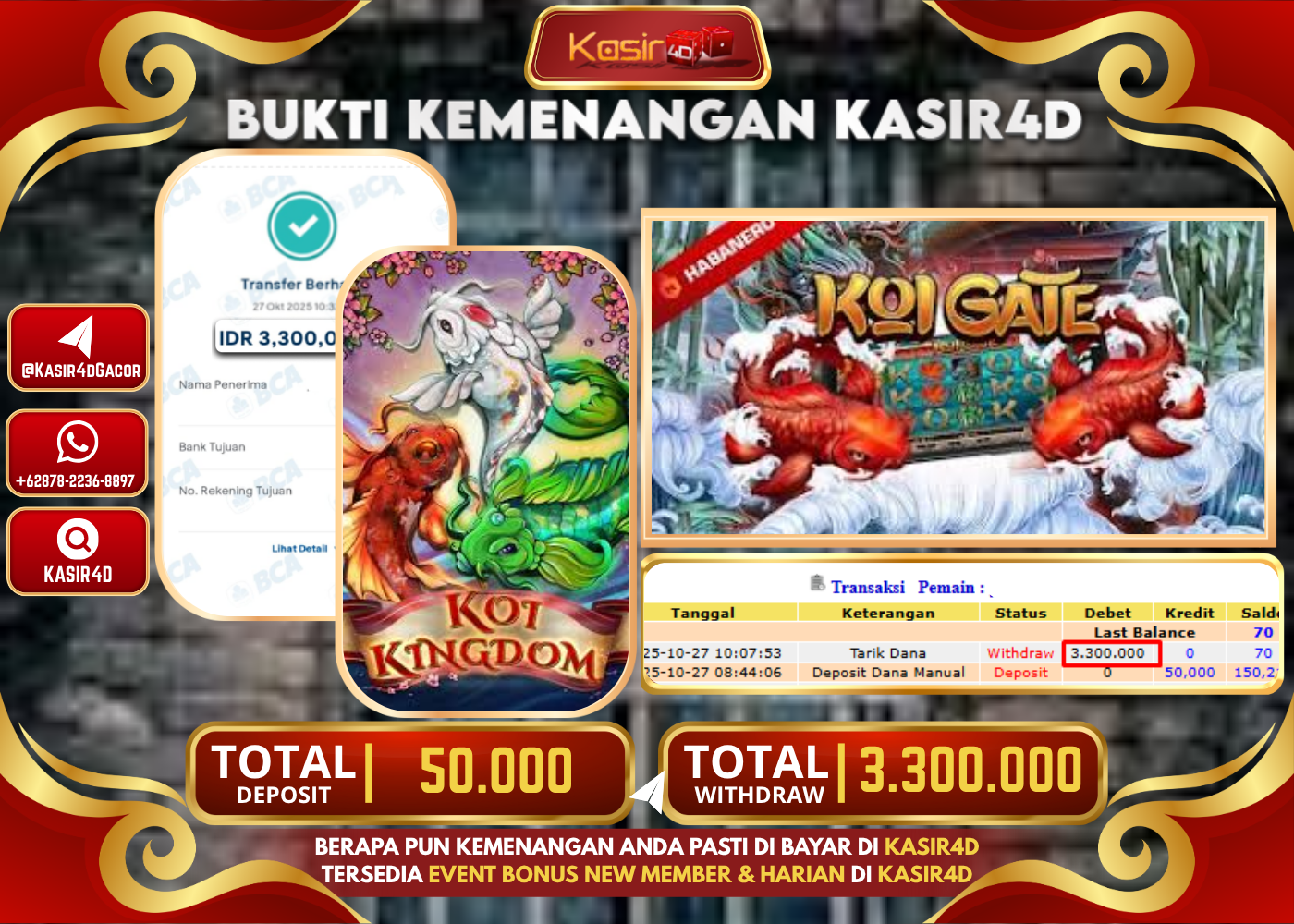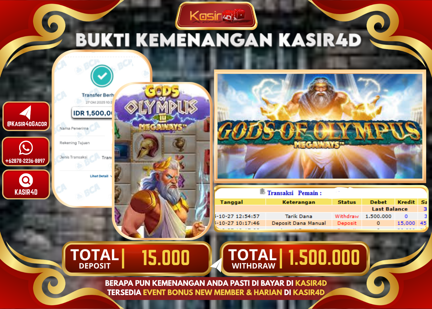 Maka tidak disangsikan kembali bila Anda memilih untuk mendaftarkan dan bermain di website slot Gacor KASIR4D , Anda terang mempunyai kesempatan besar untuk memperoleh jackpot maxwin yang spektakuler dibanding situs slot online yang lain secara umum.