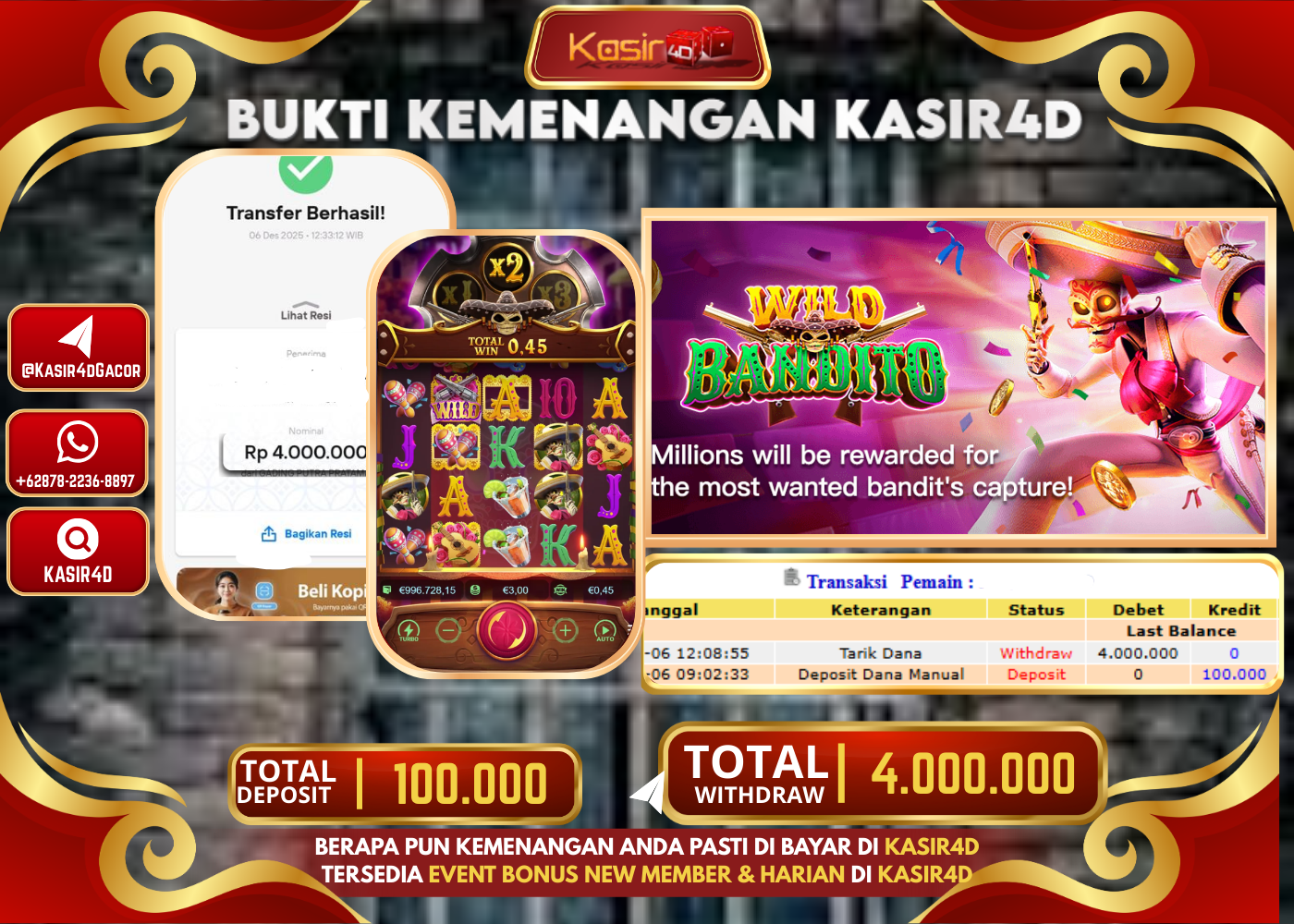 KASIR4D,Selamat Kepada User Id : I****200  Atas Withdraw Hari iniTgl 06 Desember 2025 Rp.4.000.000 Di Game PG SOFT WILLD BANDITO INFORMASI LENGKAP TERKAIT…