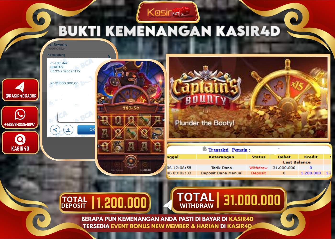 KASIR4D,Selamat Kepada User Id : T****25 Atas Withdraw Hari iniTgl 06 Desember 2025 Rp.31.000.000 Di Game PG SOFT CAPTAINS BOUNTY INFORMASI LENGKAP TERKAIT…