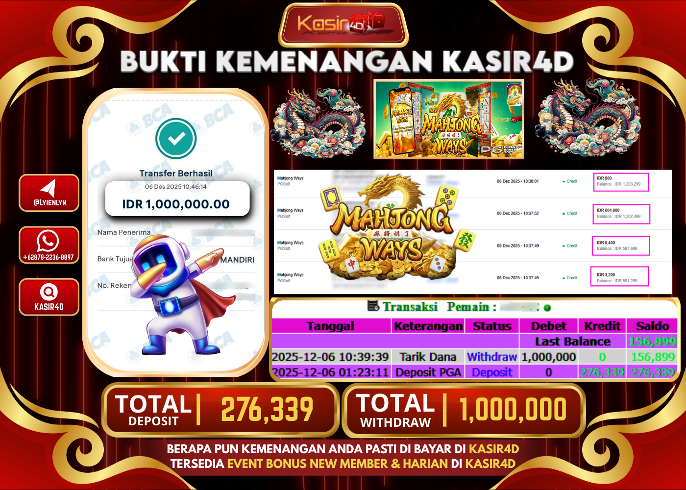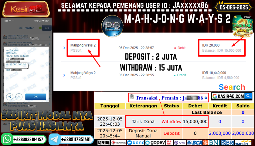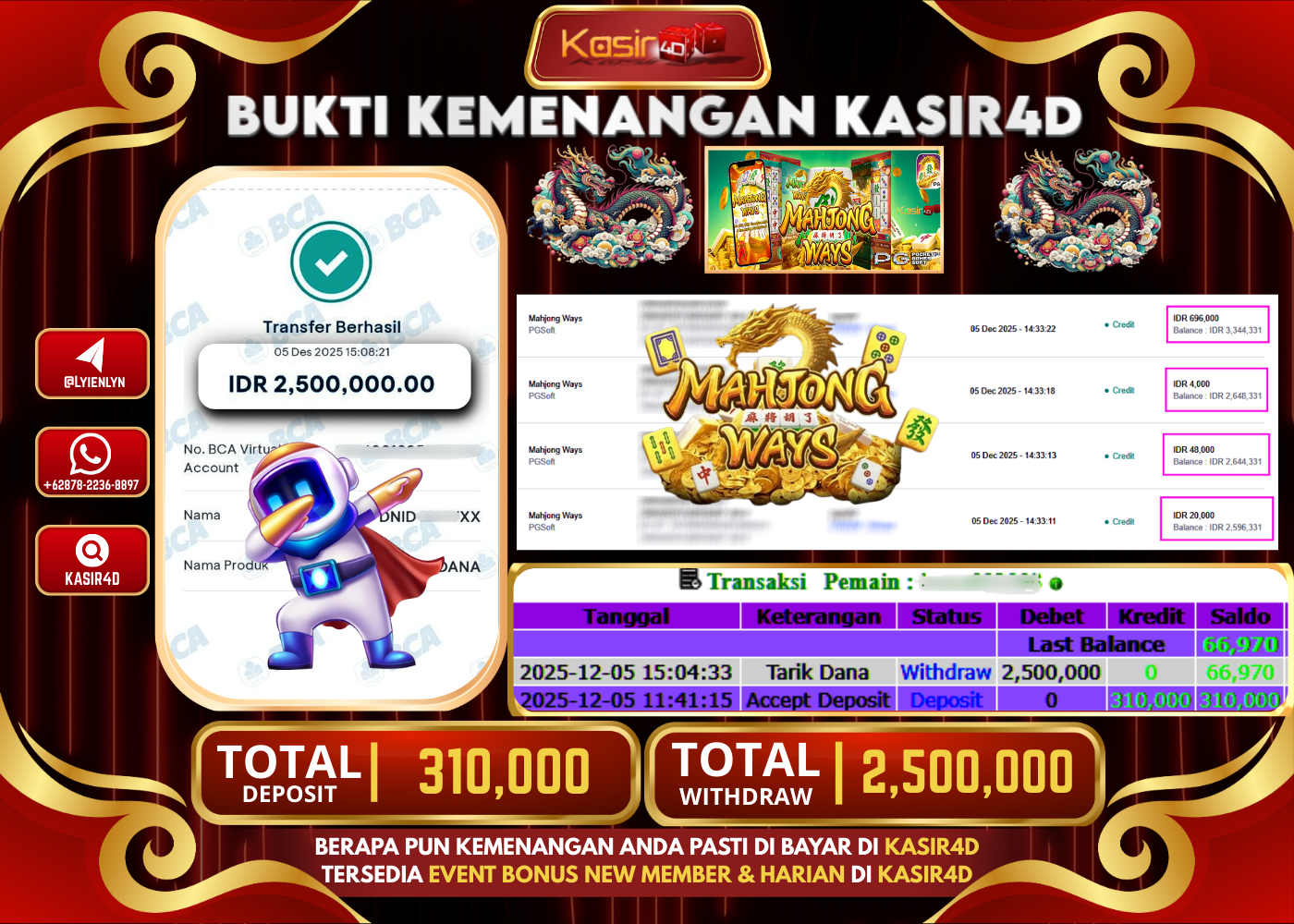 KASIR4D,Selamat Kepada User Id : JAXXXXX86 Atas Withdraw Hari ini Tgl 05 Desember 2025 Rp.15.000.000 Di Game Pg Soft Mahjong Ways 2 INFORMASI…