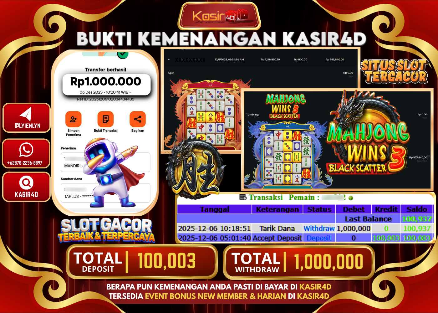 KASIR4D,Selamat Kepada User Id : RIXXXXXY Atas Withdraw Hari ini Tgl 06 Desember 2025 Rp.1.500.000 Di Game Pragmatic Play Mahjong Wins 3 – Black…