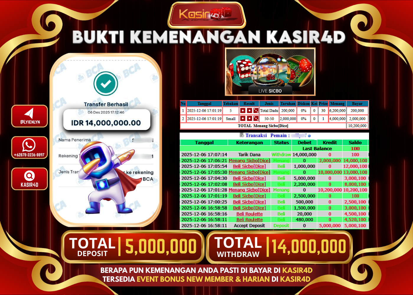 KASIR4D, Selamat Kepada User Id : GO ***** GO67 Atas Withdraw Hari ini Tgl 06 Desember 2025Rp. 14.000.000 Di Game LIVE…