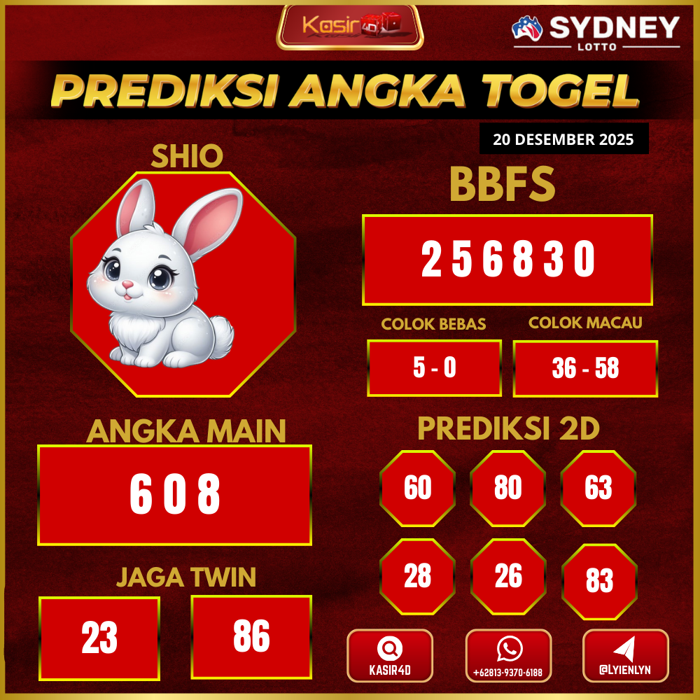 Prediksi Togel Sydney 20 Desember 2025Kasir4d hadir untuk memberikan panduan lengkap angka jitu hari ini. Pertama-tama, Anda akan menemukan data…