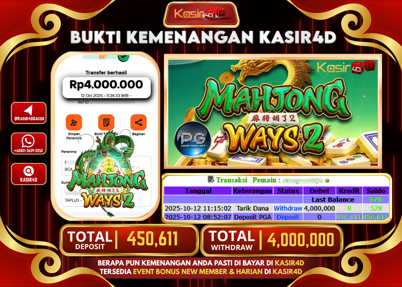 KASIR4D, Selamat Kepada User Id : Xin*****no856 Atas Withdraw Hari ini Tgl 12 Oktober 2025Rp. 4,000,000 Di Game PG SOFT MAHJONG…