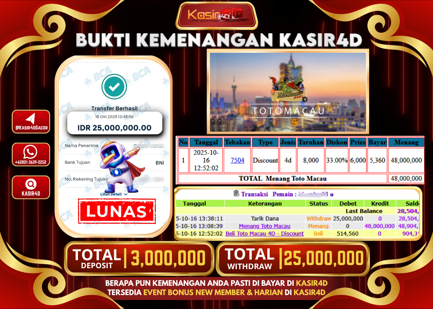 KASIR4D, Selamat Kepada User Id :Dickr*****08 Atas Withdraw Hari ini Tgl 16 Oktober 2025Rp. 25,000,000 Di Game TOGEL TOTOMACAU INFORMASI LENGKAP…