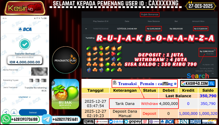 • KASIR4D,Selamat Kepada User Id : CAXXXXXNG Atas Withdraw Hari ini Tgl 27 Desember 2025 Rp. 4.000.000 Di Game Pragmatic Play Rujak Bonanza…