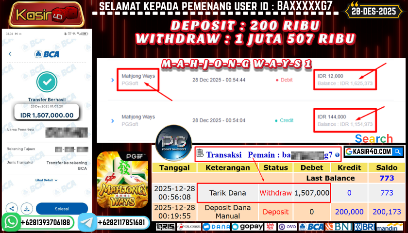 • KASIR4D,Selamat Kepada User Id : BAXXXXXG7 Atas Withdraw Hari ini Tgl 28 Desember 2025 Rp. 1.507.000 Di Game Pg Soft Mahjong Ways…