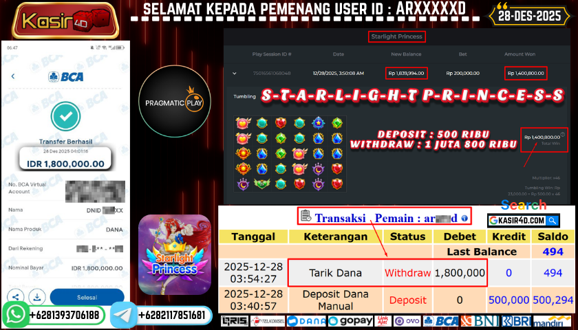 • KASIR4D,Selamat Kepada User Id : ARXXXXXD Atas Withdraw Hari ini Tgl 28 Desember 2025 Rp. 1.800.000 Di Game Pragmatic Play Starlight Princess…