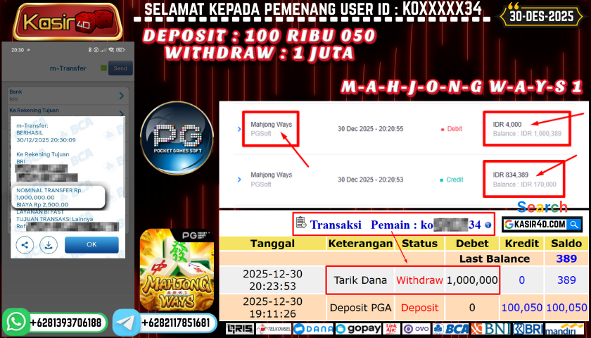 • KASIR4D,Selamat Kepada User Id : KOXXXXX34 Atas Withdraw Hari ini Tgl 30 Desember 2025 Rp. 1.000.000 Di Game Pg Soft Mahjong Ways…