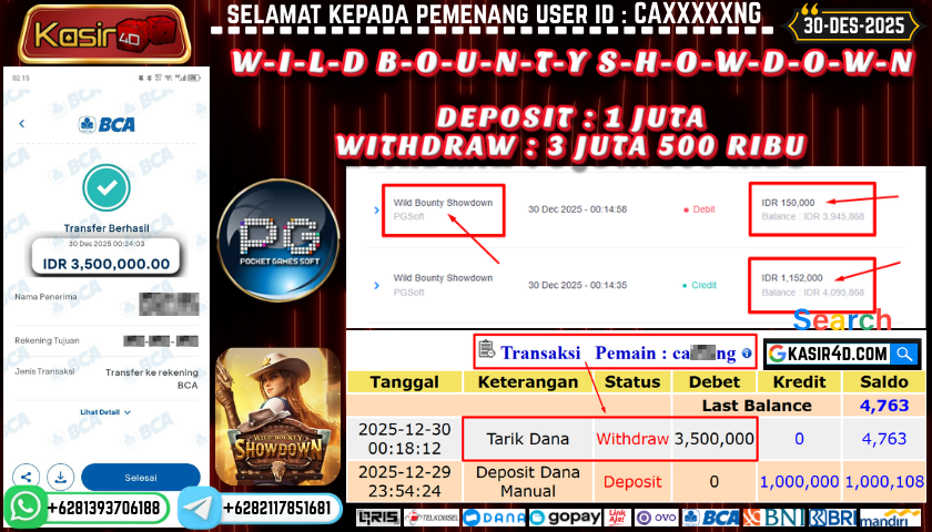 • KASIR4D,Selamat Kepada User Id : CAXXXXXNG Atas Withdraw Hari ini Tgl 30 Desember 2025 Rp. 3.500.000 Di Game Pg Soft Wild Bounty…