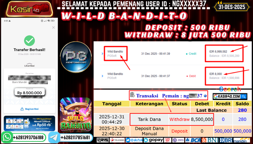 • KASIR4D,Selamat Kepada User Id : NGXXXXX37 Atas Withdraw Hari ini Tgl 31 Desember 2025 Rp. 8.500.000 Di Game Pg Soft Wild Bandito…
