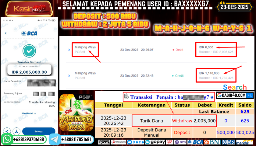 KASIR4D,Selamat Kepada User Id : BAXXXXXG7 Atas Withdraw Hari ini Tgl 23 Desember 2025 Rp. 2.005.000 Di Game Pg Soft Mahjong Ways…