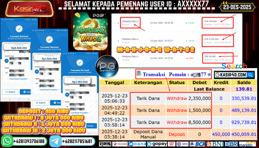 KASIR4D,Selamat Kepada User Id : AXXXXX77 Atas Withdraw Hari ini Tgl 23 Desember 2025 Rp. 12.350.000 Di Game Pg Soft Mahjong Ways…