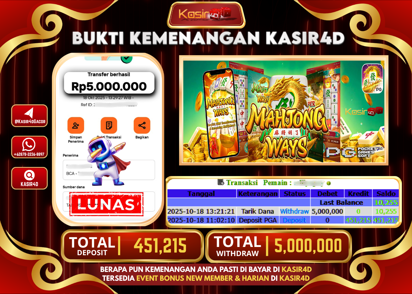 KASIR4D, Selamat Kepada User Id : Le*****k87 Atas Withdraw Hari ini Tgl 18 Oktober 2025Rp. 5,000,000 Di Game PG SOFT MAHJONG…