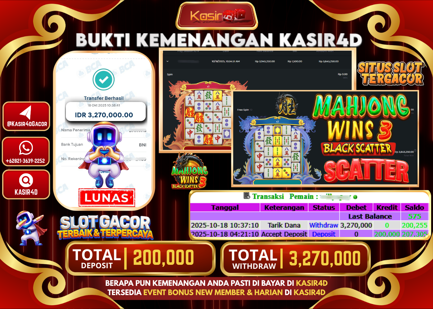 KASIR4D, Selamat Kepada User Id : Misr*****tun01 Atas Withdraw Hari ini Tgl 18 Oktober 2025Rp. 3,270,000 Di Game PRAGMATIC PLAY MAHJONG…