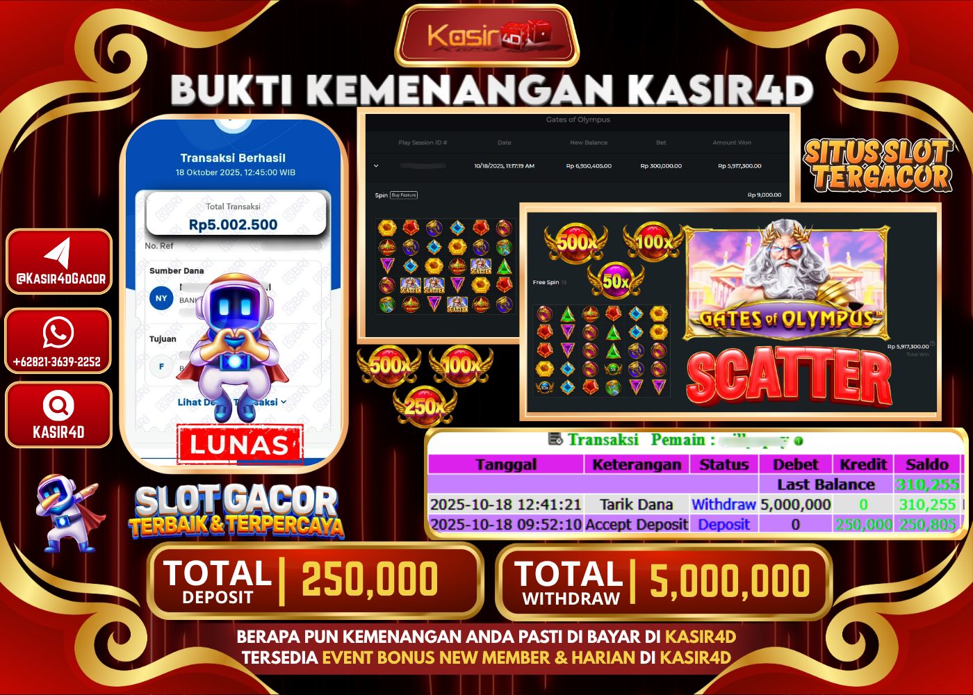KASIR4D, Selamat Kepada User Id : Es*****an77 Atas Withdraw Hari ini Tgl 18 Oktober 2025Rp. 5,000,000 Di Game PRAGMATIC PLAY GATES…