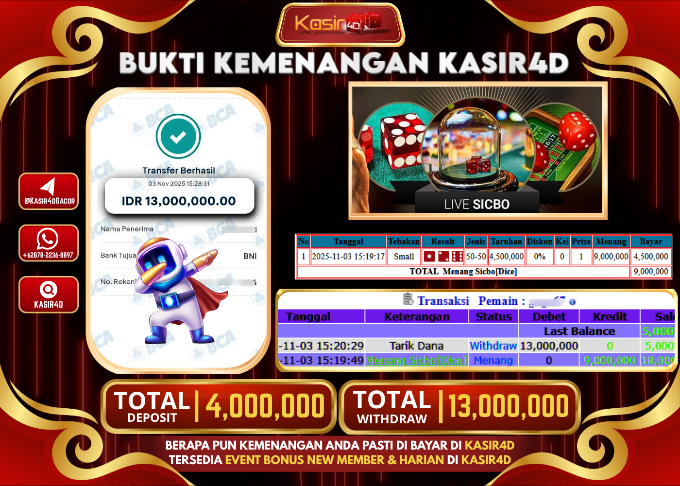 KASIR4D, Selamat Kepada User Id : Gog******o67 Atas Withdraw Hari ini Tgl 03 November 2025Rp. 10.000.000 Di LIVE GAME CASINO SICBO…