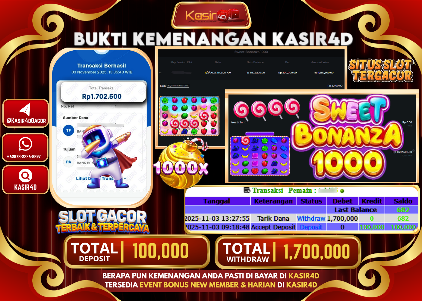 KASIR4D, Selamat Kepada User Id : Op******tan00 Atas Withdraw Hari ini Tgl 03 November 2025Rp. 1.700.000 Di Game PRAGMATIC PLAY SWEET…