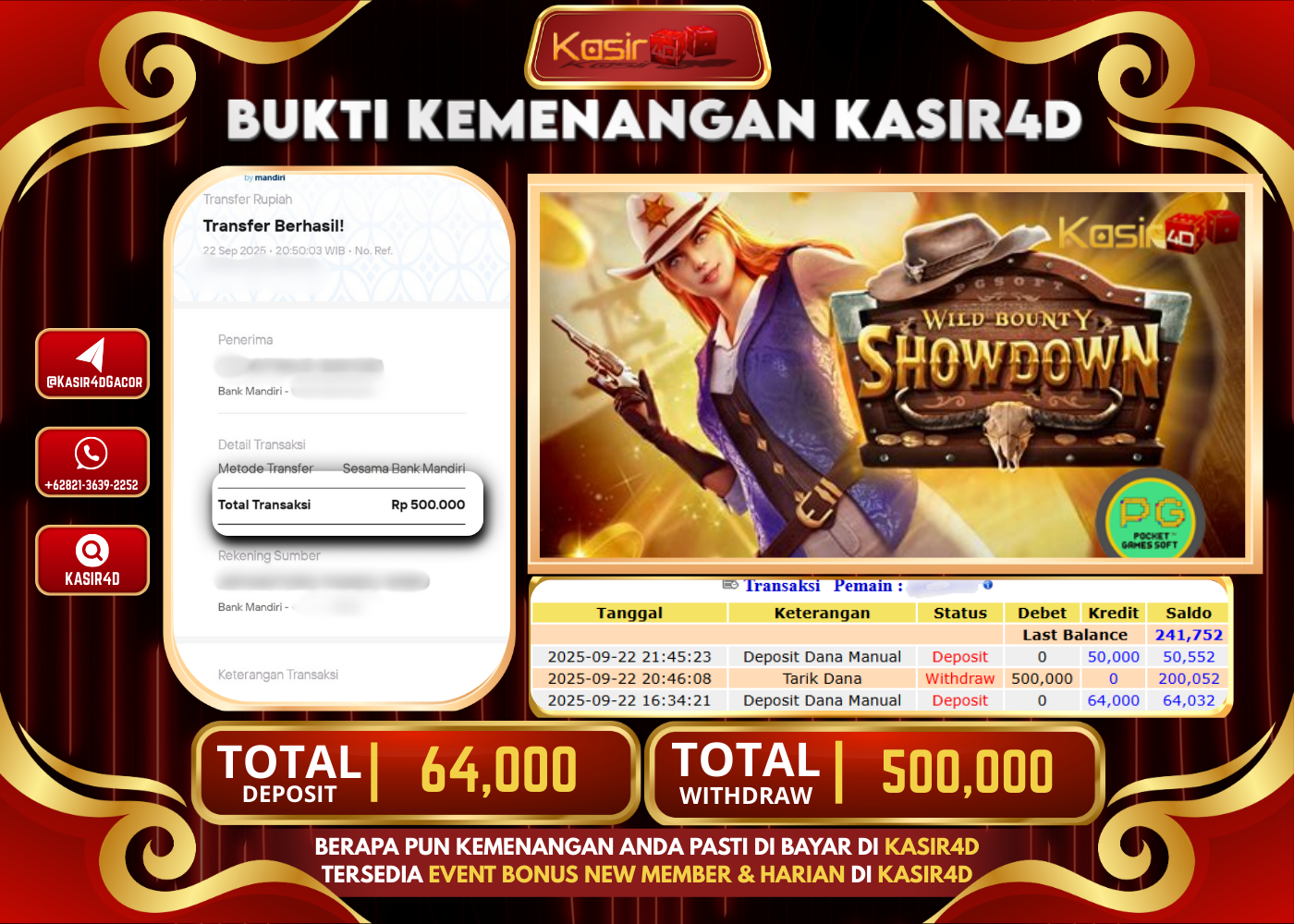 KASIR4D, Selamat Kepada User Id : G****25 Atas Withdraw Hari ini Tgl 22 September 2025Rp. 500,000 Di Game PG SOFT WILD…