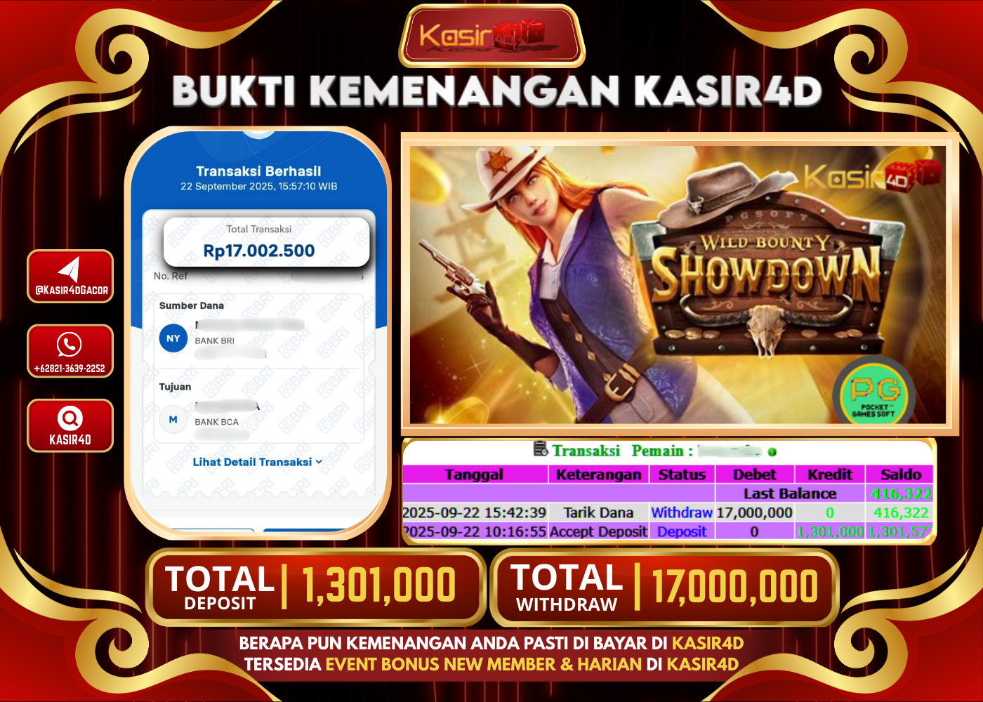 KASIR4D, Selamat Kepada User Id : Ti*****pon02 Atas Withdraw Hari ini Tgl 22 September 2025Rp. 17,000,000 Di Game PG SOFT WILD…