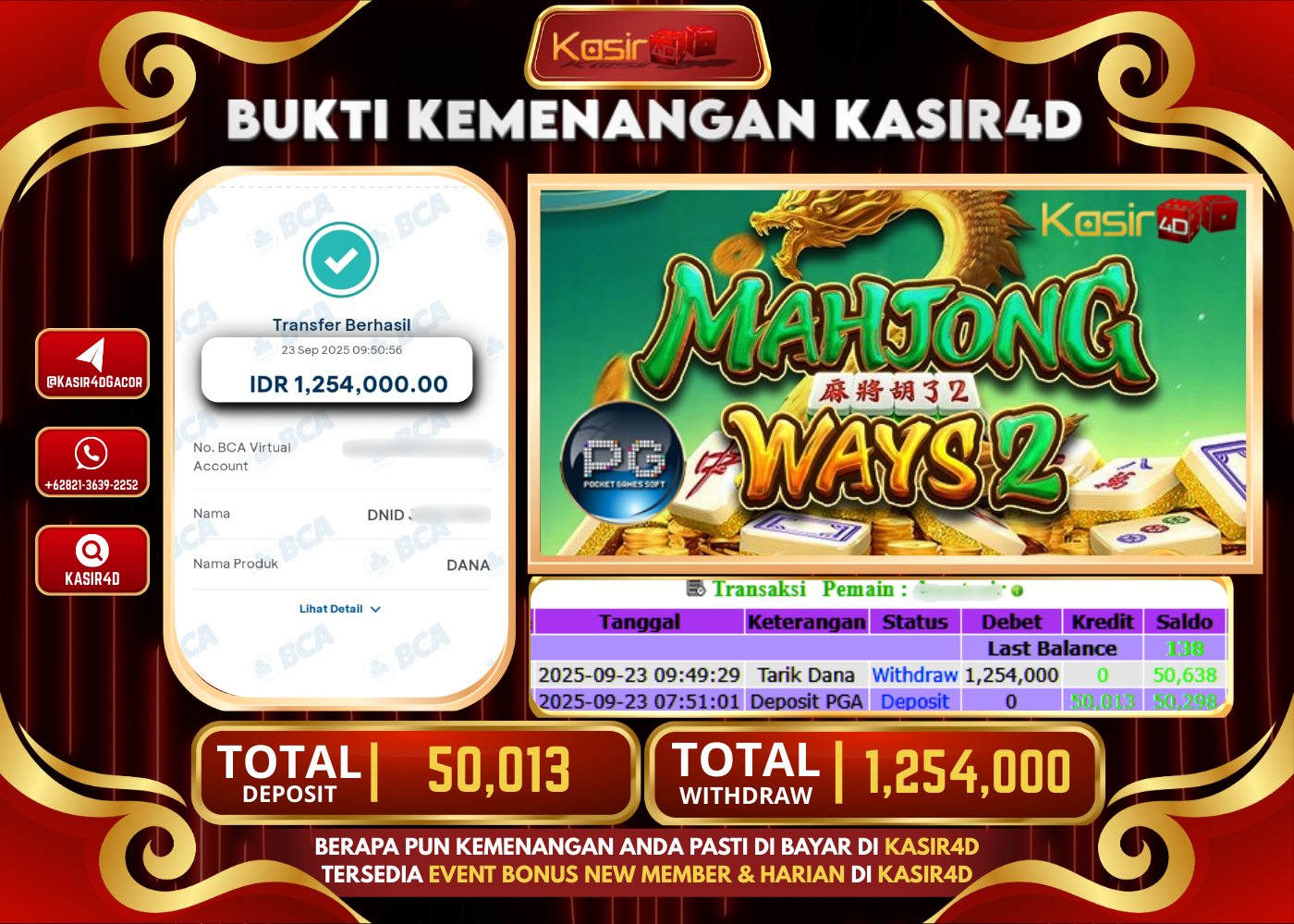 KASIR4D, Selamat Kepada User Id : Ot****an99 Atas Withdraw Hari ini Tgl 23 September 2025Rp. 1,254,000 Di Game PG SOFT MAHJONG…