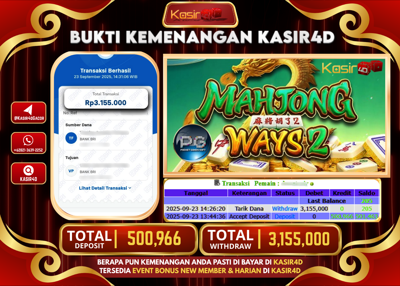KASIR4D, Selamat Kepada User Id : Up****in02 Atas Withdraw Hari ini Tgl 23 September 2025Rp. 2,004,000 Di Game PG SOFT MAHJONG…