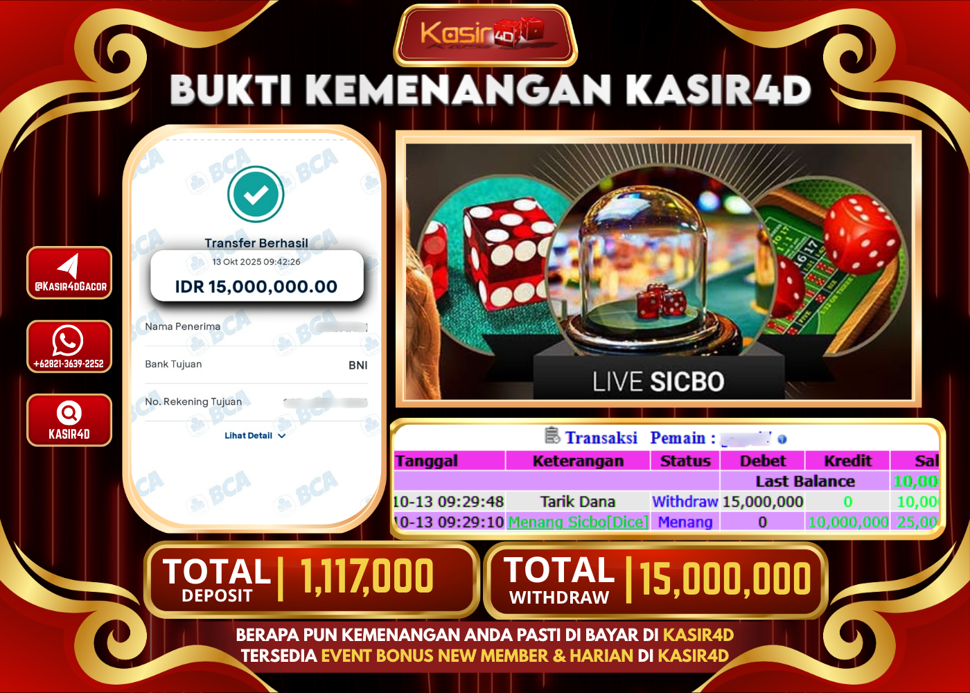 KASIR4D, Selamat Kepada User Id : Gog*****67 Atas Withdraw Hari ini Tgl 13 Oktober 2025Rp. 15,000,000 Di Game LIVE CASINO SICBO…