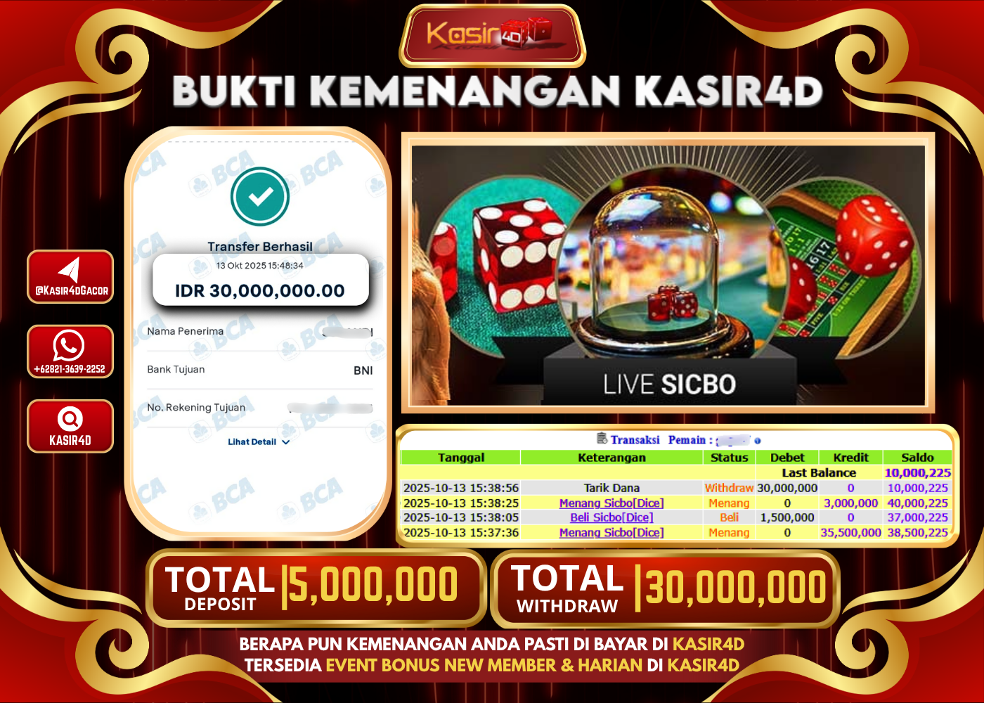 KASIR4D, Selamat Kepada User Id : Gog*****677 Atas Withdraw Hari ini Tgl 13 Oktober 2025Rp. 30,000,000 Di Game LIVE CASINO SICBO…