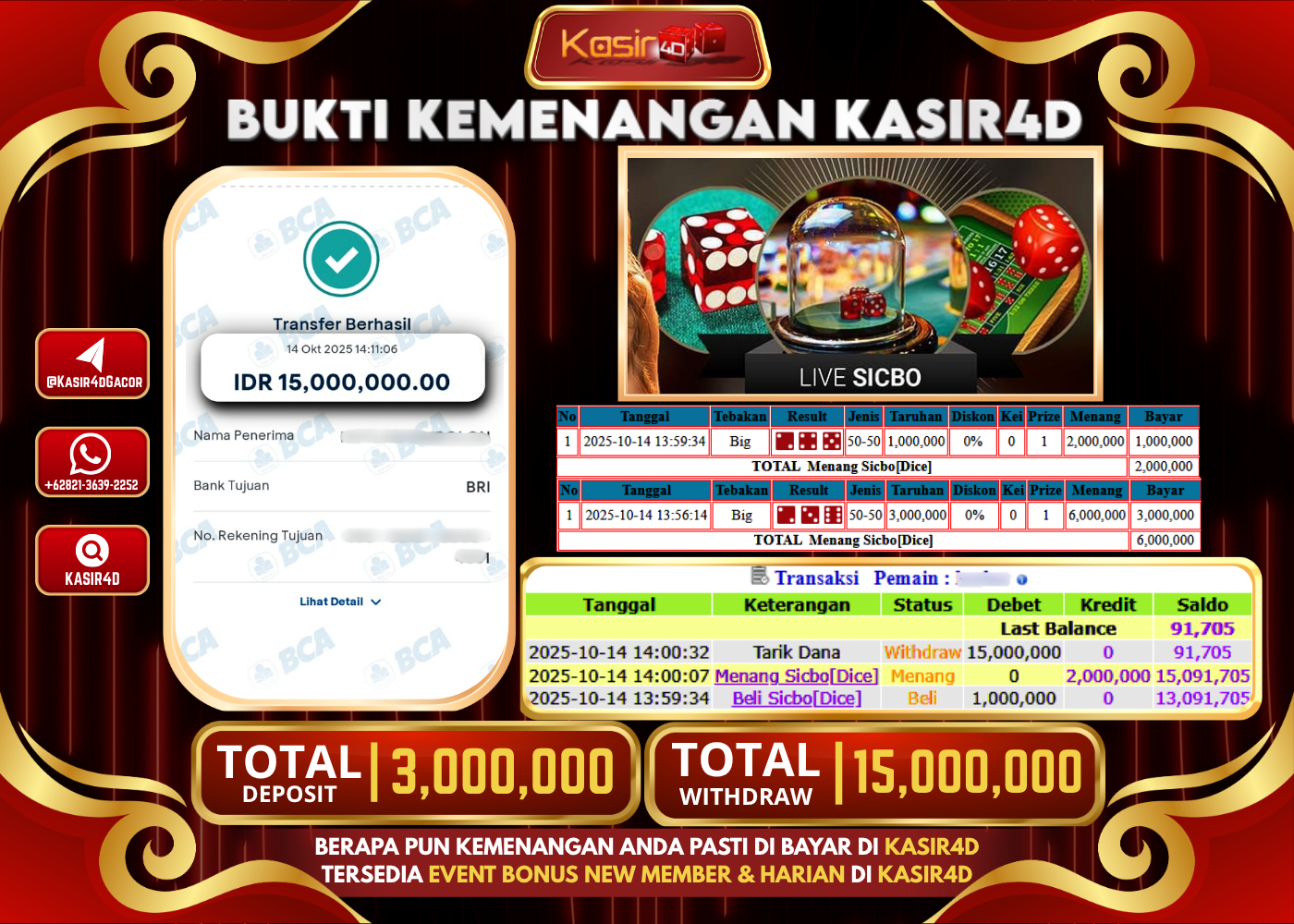 KASIR4D, Selamat Kepada User Id : Hot*****lan88 Atas Withdraw Hari ini Tgl 14 Oktober 2025Rp. 15,000,000 Di Game LIVE CASINO SICBO…