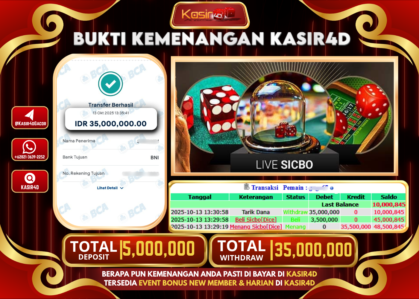 KASIR4D, Selamat Kepada User Id : Gog*****677 Atas Withdraw Hari ini Tgl 13 Oktober 2025Rp. 35,000,000 Di Game LIVE CASINO SICBO…
