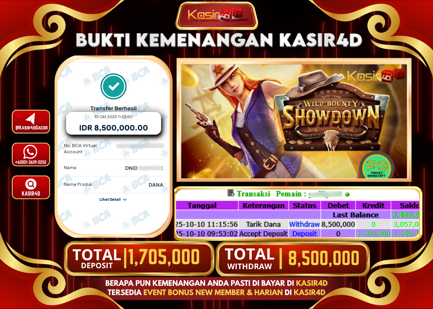 KASIR4D, Selamat Kepada User Id : Fa*****rt857 Atas Withdraw Hari ini Tgl 10 Oktober 2025Rp. 8,500,000 Di Game PG SOFT WILD…