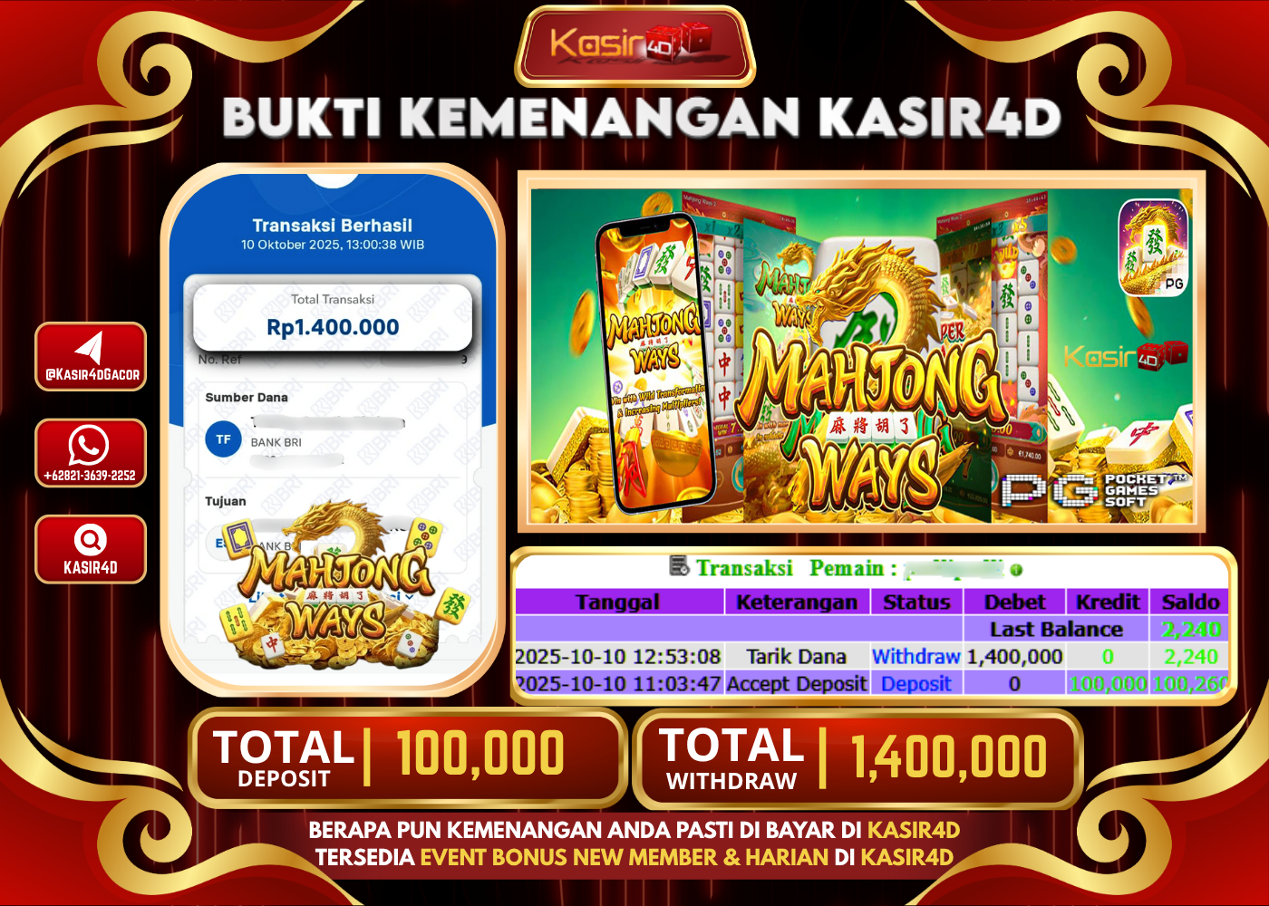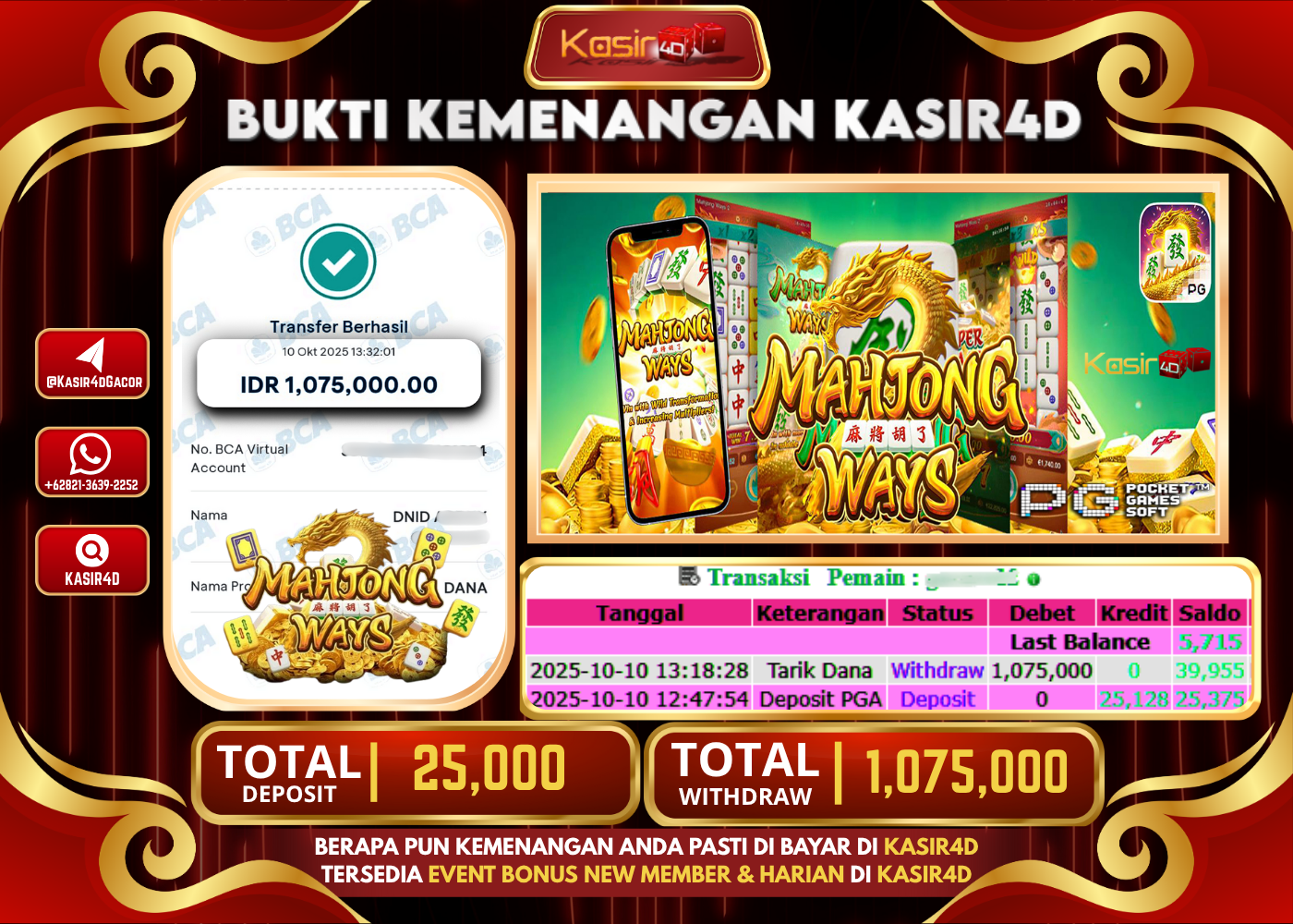 KASIR4D, Selamat Kepada User Id : Si*****to996 Atas Withdraw Hari ini Tgl 10 Oktober 2025Rp. 1,075,000 Di Game PG SOFT MAHJONG…