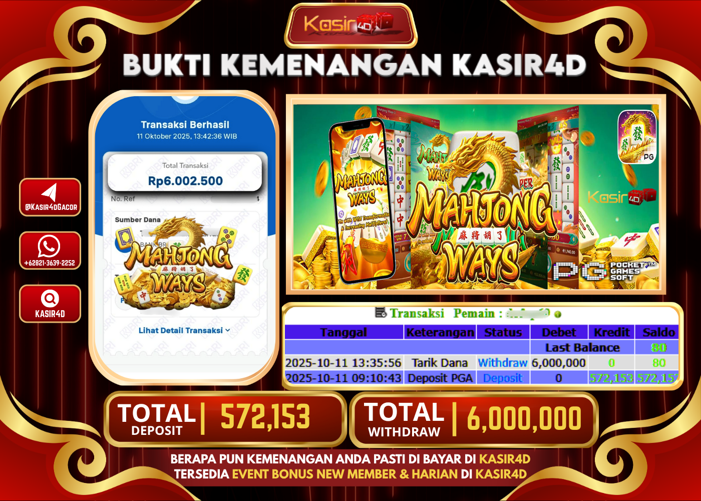 KASIR4D, Selamat Kepada User Id : Be*****to012 Atas Withdraw Hari ini Tgl 11 Oktober 2025Rp. 6,000,000 Di Game PG SOFT MAHJONG…
