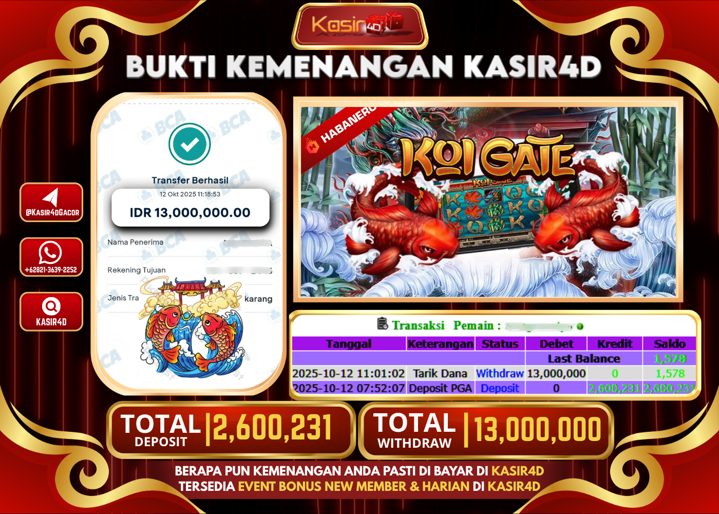 KASIR4D, Selamat Kepada User Id : Si*****lo33 Atas Withdraw Hari ini Tgl 12 Oktober 2025Rp. 13,000,000 Di Game HABANERO KOI GATE…