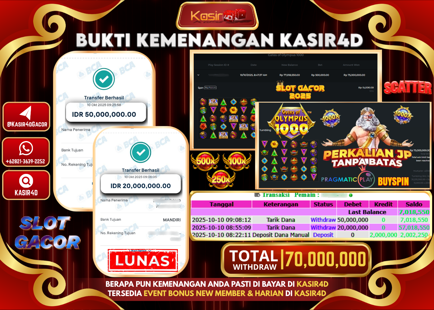 KASIR4D, Selamat Kepada User Id : 300*****ard89 Atas Withdraw Hari ini Tgl 10 Oktober 2025Rp. 70,000,000 Di Game PRAGMATIC PLAY GATES…